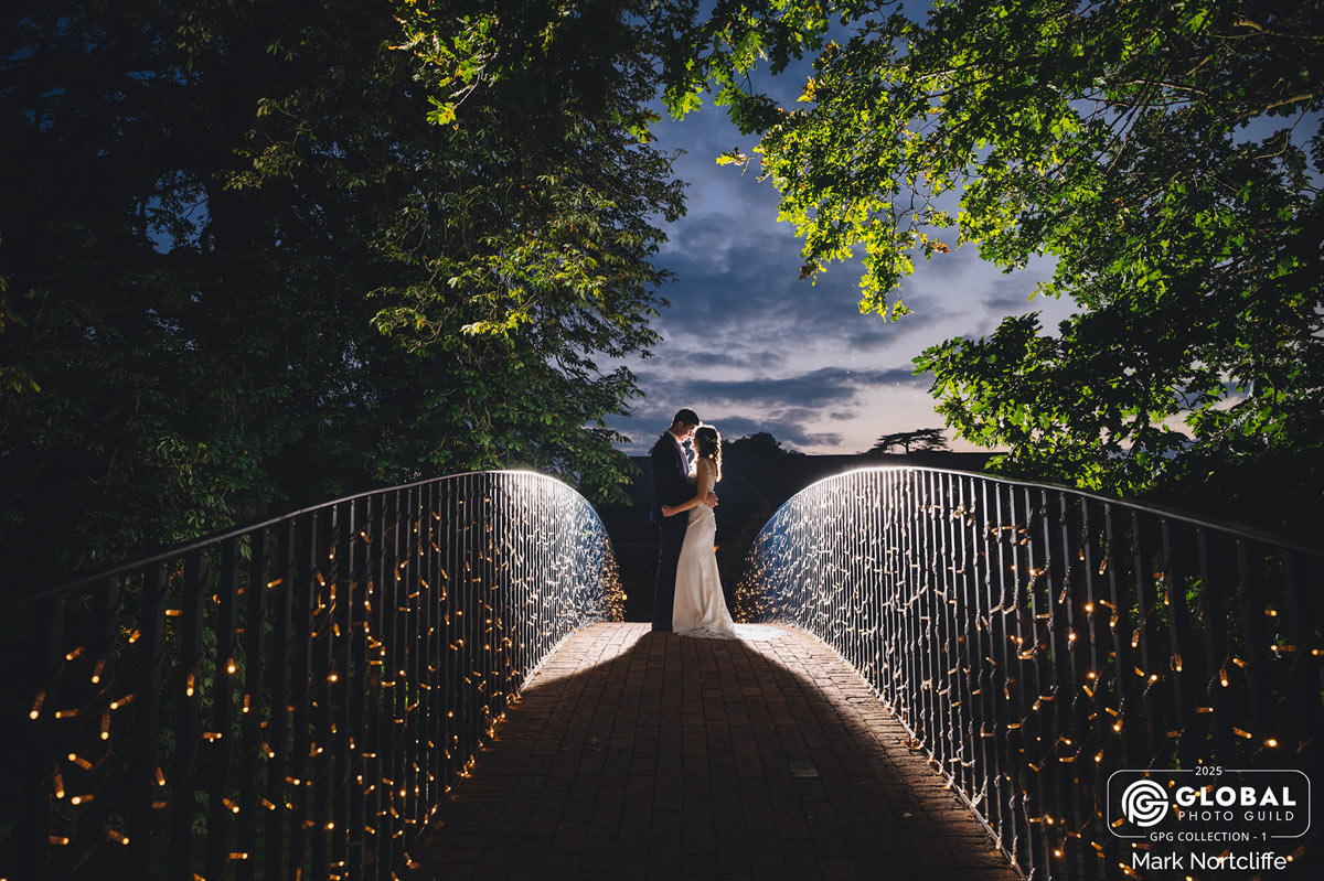 This image was taken at the amazing Bassmead Manor in Cambridgeshire UK. Shooting on this iconic bridge at the venue just before dusk is the perfect setting. The recent addition of the lights on the balustrade enhance the atmosphere of this wonderful shot. The framing with the over hanging branches adding to the impact and drama. Having couples that trust you to take them away from their guests and the dance floor is reward in itself.