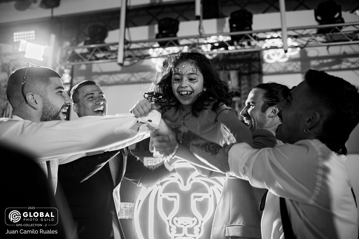 This photo was captured during the party. The bride’s niece, who was on the DJ’s stage, jumped into her aunt and uncle’s arms. Carried away by the excitement, they tossed her into the air. Her face says it all—she was having the time of her life.
