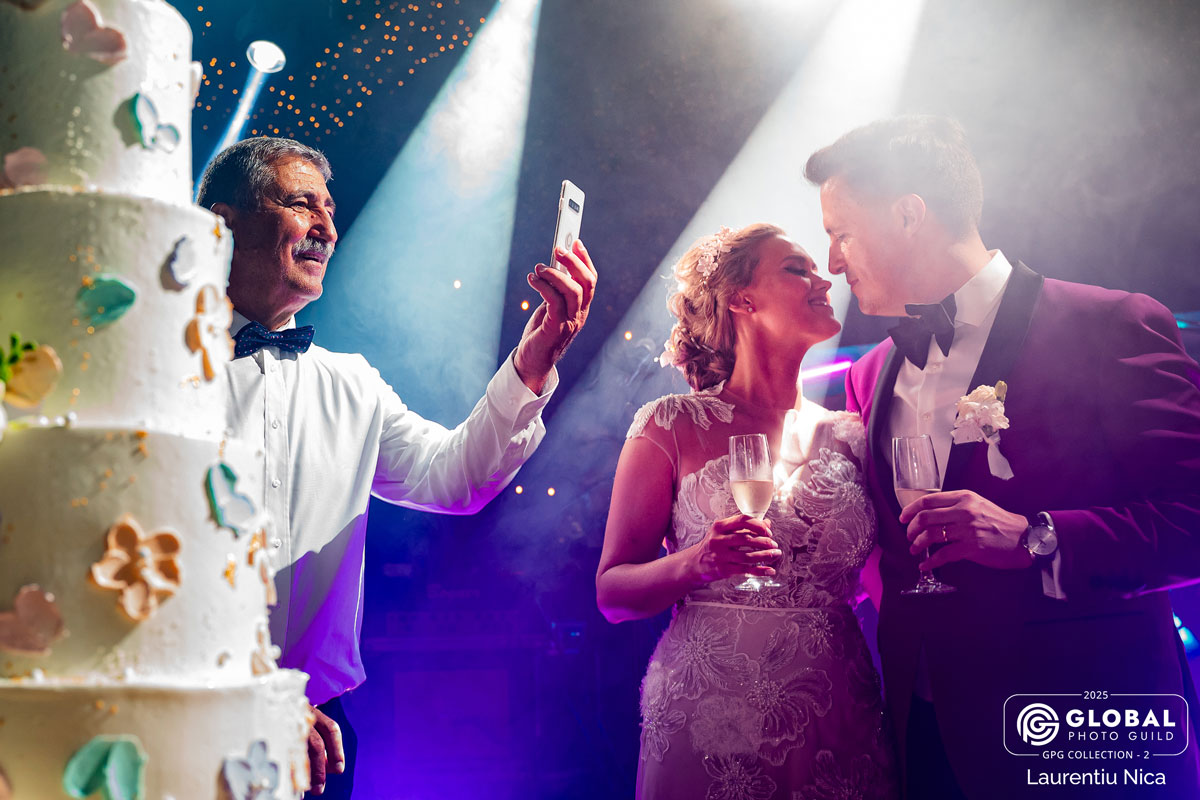 Real moment at the reception, with the father of the bride filming with the phone behind the wedding cake.