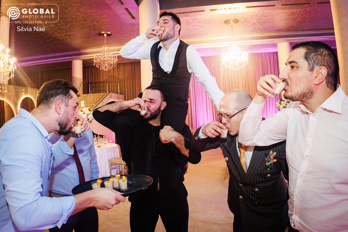 place : north Italy, multiethnic wedding. A funny moment from the party when the relatives drink together like an competition in the same time .