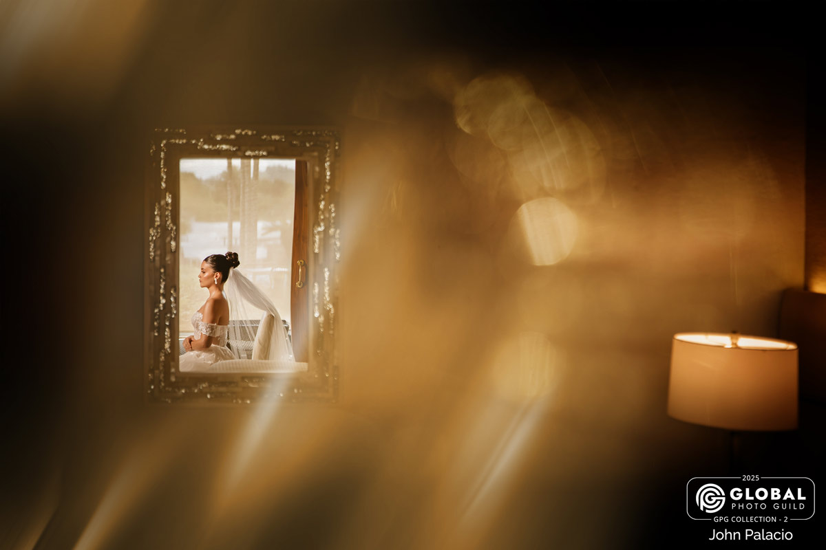 En una de las suites del Hotel Visus, encontré a la novia perdida en sus propios pensamientos antes de encontrarse con el amor de su vida. Al encuadrarla a través del marco de un espejo y jugar con la luz cálida que llenaba la habitación, busqué reflejar la intimidad, la anticipación y el ambiente de ensueño de esos minutos previos. El resultado transmite calma y belleza, resaltando la esencia de la protagonista en un entorno de lujo y paz.