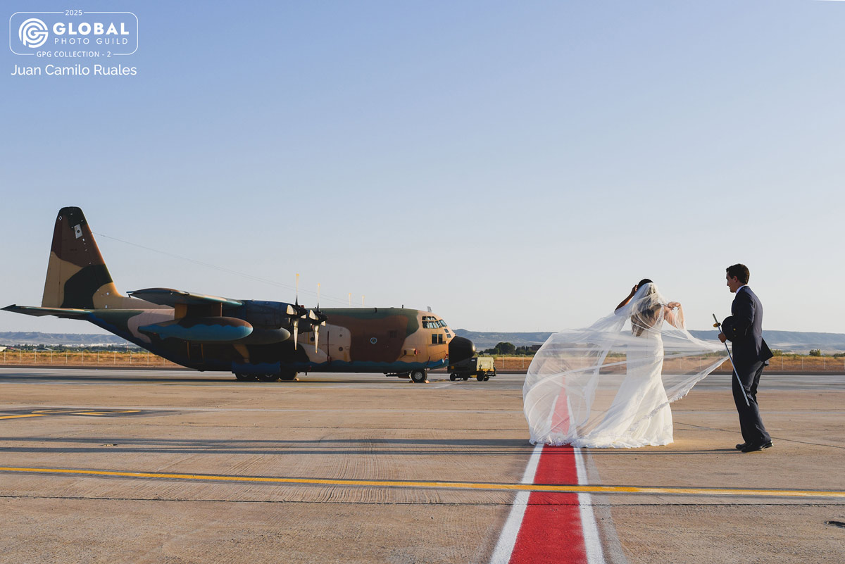 As we approached to take some photos with the airplane, I let the couple walk ahead. When the groom helped the bride with her dress, I decided to capture this moment—preserving the naturalness of their interaction and the grandeur of the aircraft.