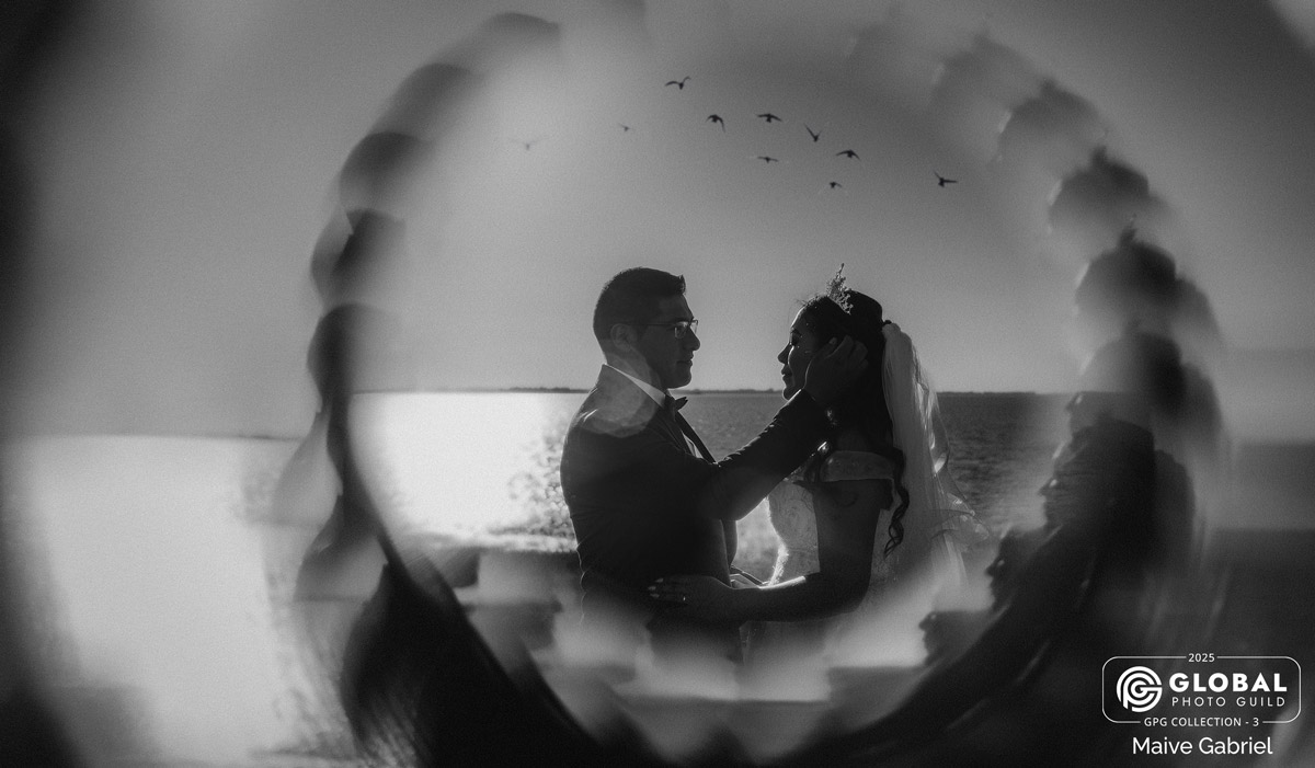 Gabi & Sol’s Post-Wedding Session. With the sun setting over the lagoon, the reflection and focus play frame the couple’s connection. A visual metaphor that even through life’s detours and reflections, love always remains at the center.