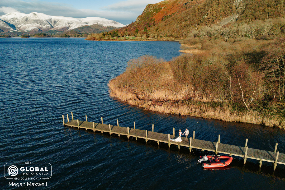 My bride wanted an epic photo of her ceremony room by night. With the couple dry indoors, I ventured into the rain to take this image. I used a mirror to create the reflection & my assistant held a softbox over the couple's head to gently feather the light. Two additional flashes were placed inside with full CTO gels, to enhance the existing ambience.