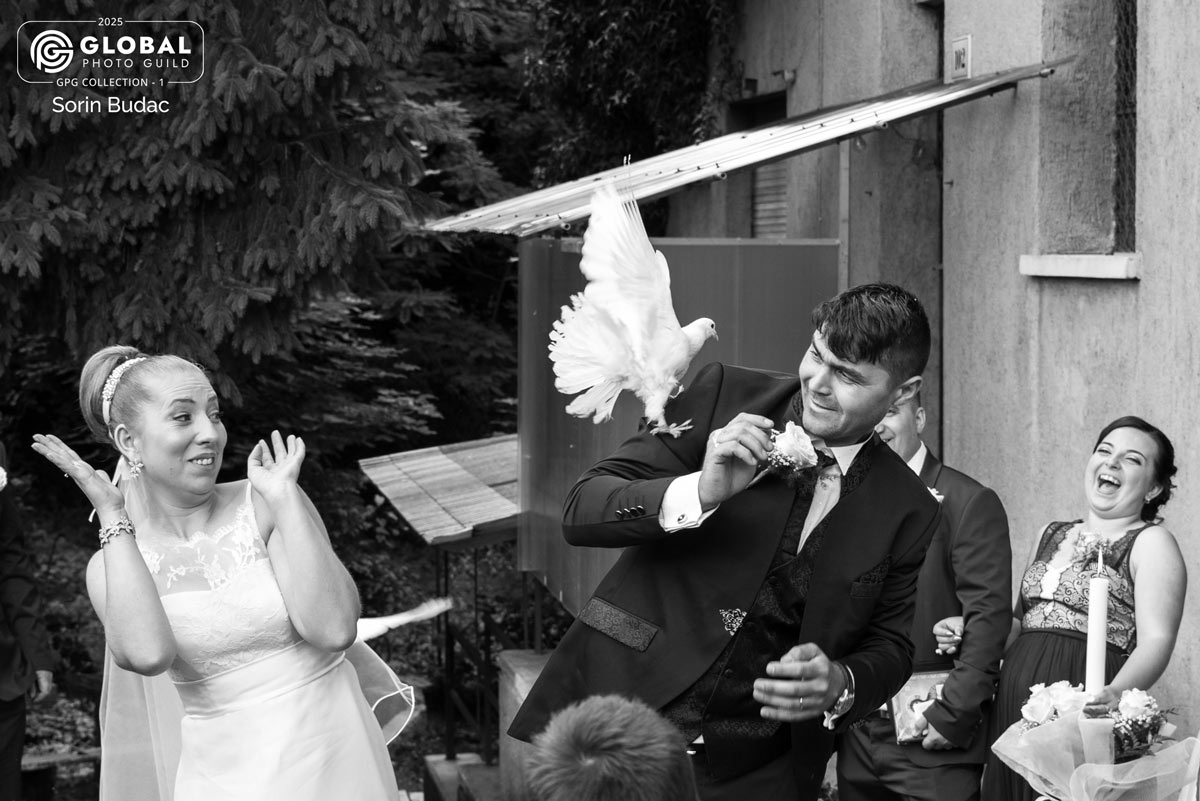 place: north Italy , the moment of 2 year ago when the bride and groom was waiting in front of the church from friends and relatives, the moment is the white dove landed on the groom's coat