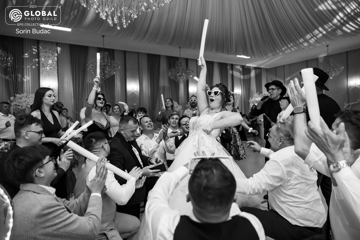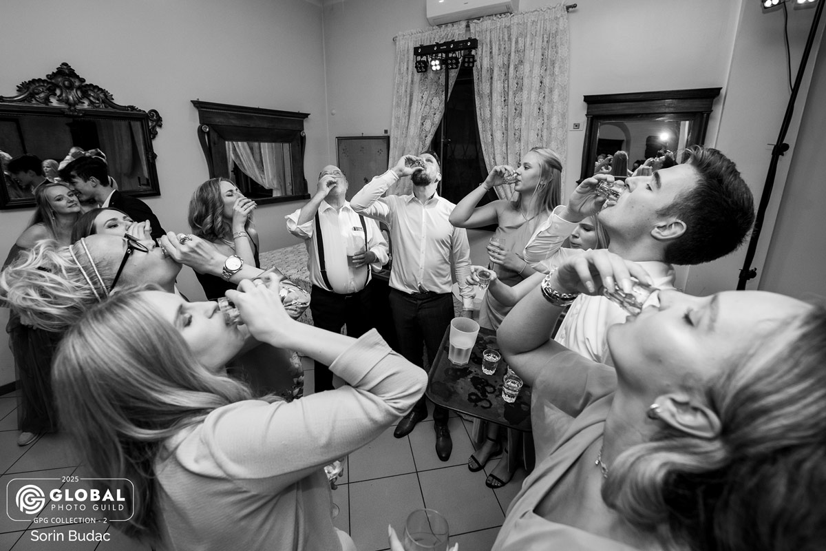 place : north Italy, multiethnic wedding. A funny moment from the party when the relatives drink together like an competition in the same time .